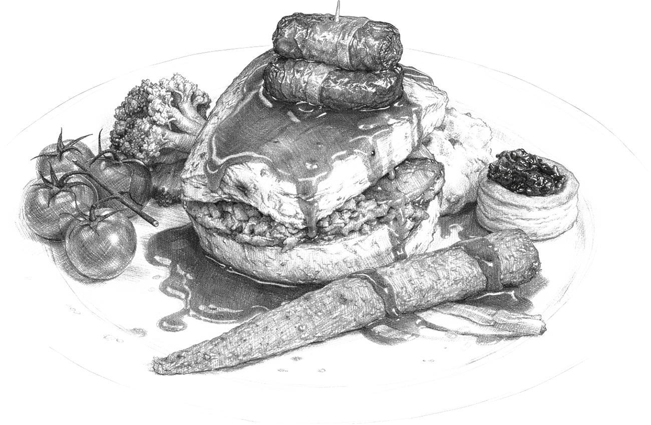 with chipolata sausage, bacon roll & cranberry vol-au-vent with roast gravy